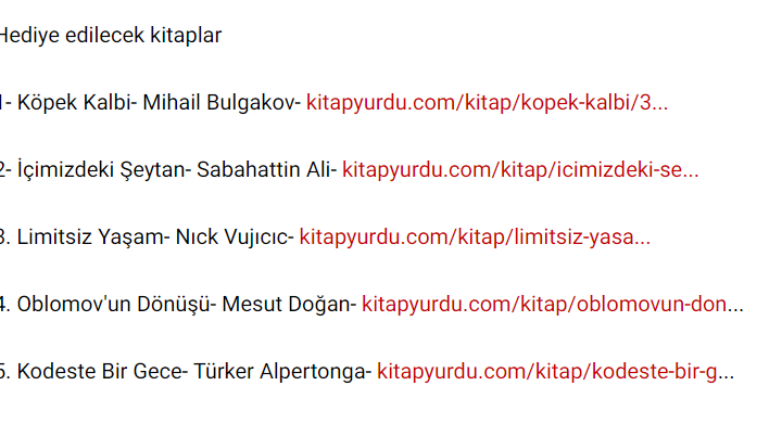 5 Kitap ikram ediyoruz. Kitap Şuuru sayfası olarak her hafta şartlarımızı yerine getirme vaadinde bulunan takipçilerimize kitap hediye ediyoruz. Bu hafta birbirinden farklı, birer adet olmak üzere toplam 5 kitabı müdavim ve takipçilerimize hediye edeceğiz. Sonuçlar 30 Eylül günü saat 21.00’de açıklayacağız. Hediye kazanan kişilerin listesini sayfamızdan açıklayacağız. Başvuru sayfası: https://1000kitap.com/gonderi/139130694 Şartlarımız;A.) Bir kişi her hafta…